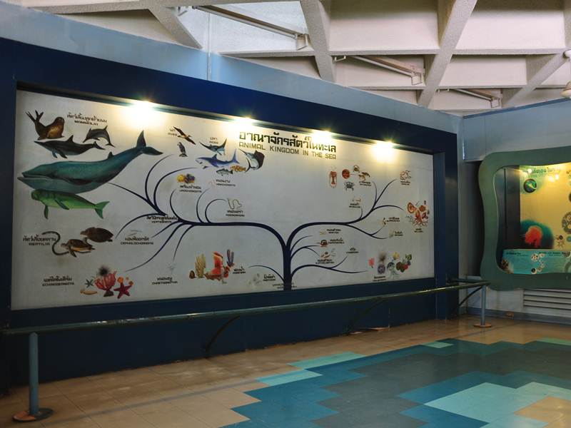 ให้ความรู้ตั้งแต่สิ่งมีชีวิตขนาดเล็กๆที่อาศัยอยู่ในทะเล คือ แพลงก์ตอนซึ่งมีบทบาทสำคัญของห่วงโซ่อาหารในทะเล สาหร่าย และหญ้าทะเล ฟองน้ำ สัตว์ที่มีโพรงลำตัว เช่น ปะการัง ดอกไม้ทะเล แมงกะพรุน เป็นต้น สัตว์จำพวกหนอนทะเล เช่น หนอนตัวแบนหนอนปล้อง หนอนริบบิ้น เป็นต้น สัตว์จำพวกหอย เช่น หอยฝาเดียว หอยฝาคู่ หมึก และหอยงวงช้าง เป็นต้น สัตว์ที่มีข้อปล้องในทะเล เช่น ปู กุ้ง กั้ง และแมงดาทะเล เป็นต้น สัตว์จำพวกคอร์เดทในทะเล เช่น เพรียงหัวหอม แอมฟิออกซัส และสัตว์ทะเลที่มีกระดูกสันหลัง ชนิดต่างๆ ได้แก่ ปลาทะเล โลมา พะยูน เต่าทะเล และจระเข้น้ำเค็ม รวมทั้งเรื่องราวของทะเล และสิ่งมีชีวิตในทะเลยุคดึกดำบรรพ์